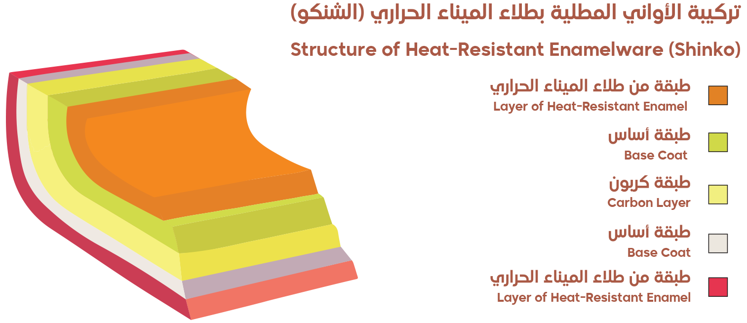السلامة : لا تنبعث اي مواد ظارة خلال عملية الطبخ ويمكن للأافراد الذين لديهم تحسس من مادة النيكل إستخدامها، إن الأواني المطلية بطلاء الميناء الحراري (الشنكو) تعكس جودة وثقة عاليتين لدرجة أن الطعام سيكون صحياً ولذيذا فهي بمنظر جمالي لامع ، ومثاليـة في أسطحها الداخلية وتحملها درجة حرارة عالية (800 درجة مئوية).